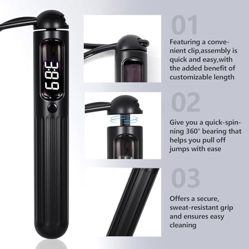 Jump rope with counter Clear and bright LED display provides real-time feedback on key statistical data: exercise duration, number of jumps, and calories burned. You can freely set training goals and switch between multiple intelligent modes (such as free, timed, and counted) to truly personalize your workout plan.